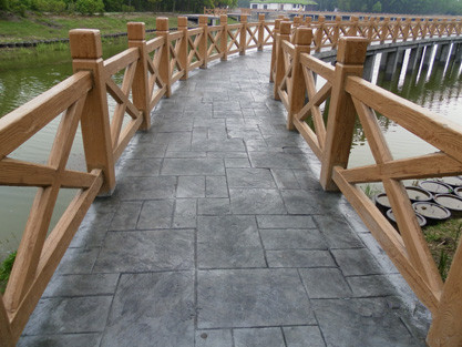 仿真木紋模具壓制紋理是目前園林景觀最流行的一種水泥仿木紋理的制作方法,仿木模具有很多工廠都有定做。具體做法:用做好的圓型木紋模具壓滾,在水泥表面材料上壓制出深淺不一的木紋,在30度下養護24小時后脫模,用苯丙外墻涂料配成木紋的顏色進行木紋刷制,有木結子年輪的地方要配深一些的色漿來完成木紋的仿真描繪。